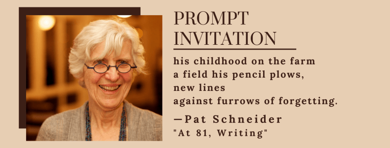 One of our Board Members had the brilliant idea to honor Pat by using her work as prompts in AWA workshops. We’re collecting these invitations here and also sharing them in our monthly emails to affiliates. We also hope this serves to produce a body of work that we could collect, at some point, for a celebration of Pat.